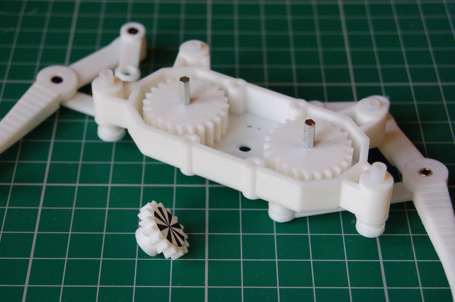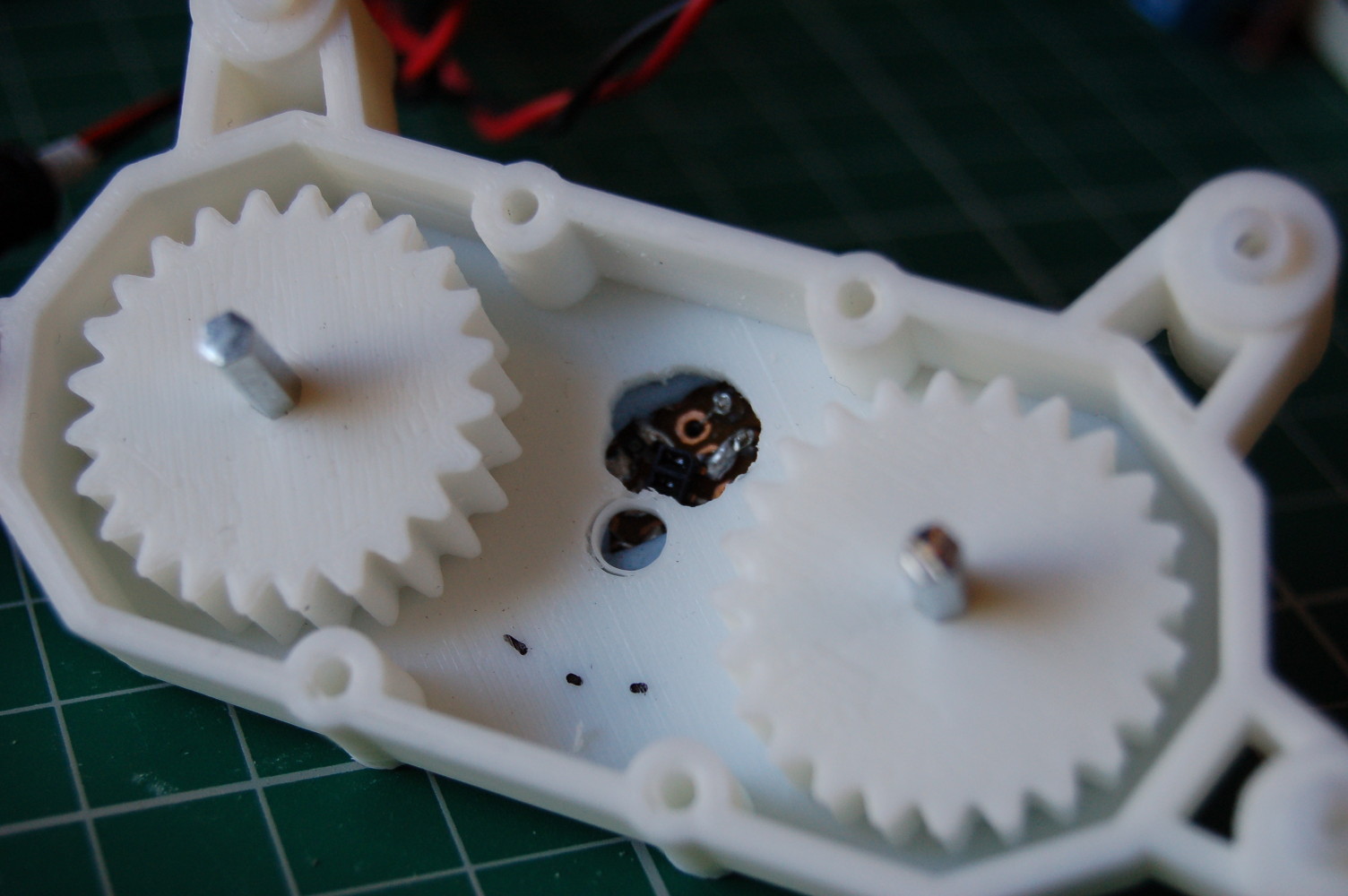 We are using a reflective infrared sensor (ITR8307) that is looking at an encoder disc with black and white stripes, inside the gearbox. The encoder disc is just a piece of paper glued to the center gear driven by the motor. An improvised hole provides a window for the sensor to peek inside. If we measure how long it takes for one stripe to pass in front of the sensor, we can calculate speed (RPM). Knowing the actual speed can enable better control of the motors and also to implement dead reckoning. We are only detecting speed, without direction, to keep things simple. (We want to avoid sudden changes in direction anyway, and the motors are not that fast, so assuming we’re always going the correct way may be safe.)