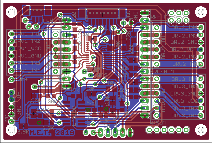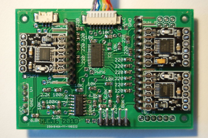 Last year we had to control four DC motors and five servos, and used an ATmega328 microcontroller, so the number of pins and available PWM outputs were a bit limited. This is why we added another component, a PCA9685 breakout board (a dedicated I2C 16-channel PWM controller). For motor drivers, we used two DRV8833 2-channel motor driver boards. The assembly of all these was the ACF-MAS (Actuator Controller For Motors And Servos). It worked great, it was really easy to use, but it was all a bit bulky.