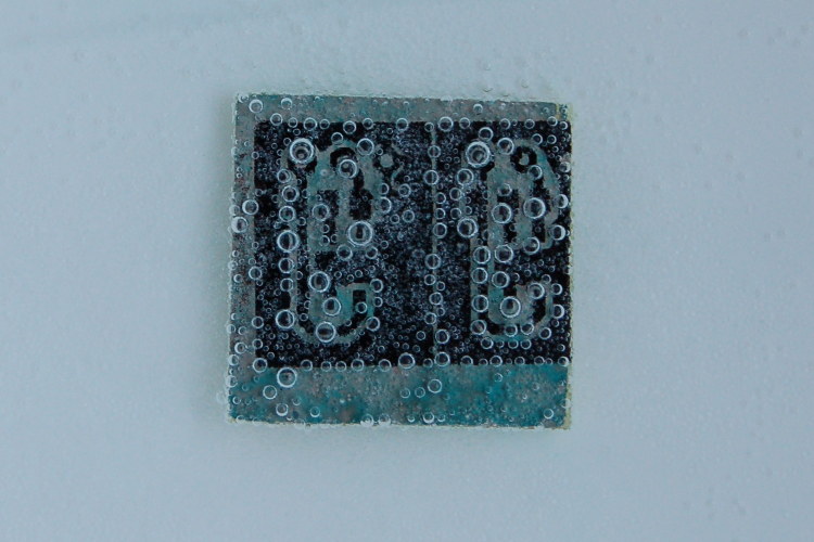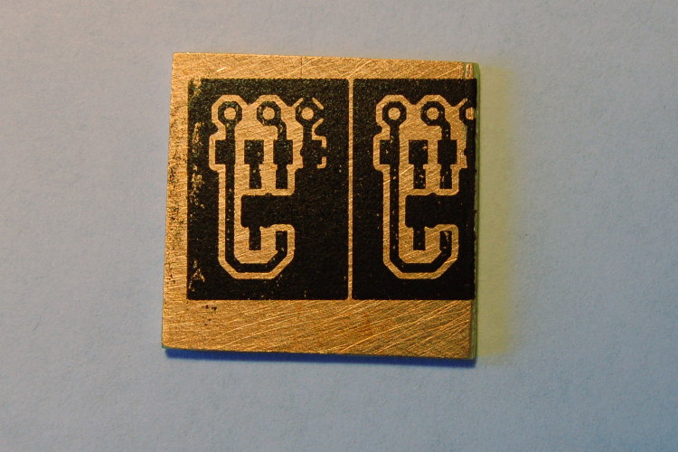- With a hot iron, transfer this image to the copper surface of the PCB (temperature and pressure is precisely controlled: just press it hard and remove it before things start to burn).
