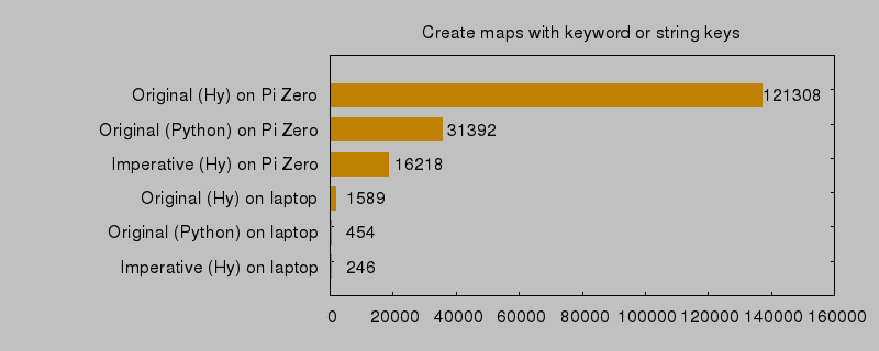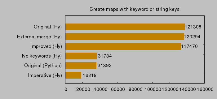 No keywords (Hy): Following the above: let’s keep the original Hy source, but replace keywords with plain strings: almost exactly the same speed as the Python version. That makes sense, so Hy is not really worse than Python – but why are strings faster? Let’s put this aside for now and try to optimise further…