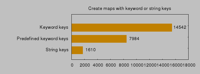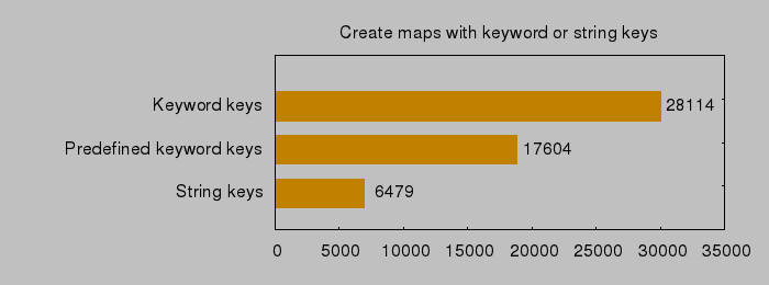 {:foo 1 :bar 2} in Hy is translated to {HyKeyword('foo'): 1, HyKeyword('bar'): 2}. Compare this with {"foo": 1, "bar:", 2}: with keywords, we’re creating new instances of the HyKeyword class every time we specify a key! The same thing happens when accessing a value: (:foo mymap) becomes mymap.get(HyKeyword("foo")). And of course this explains why there is a big difference, as we can see below.