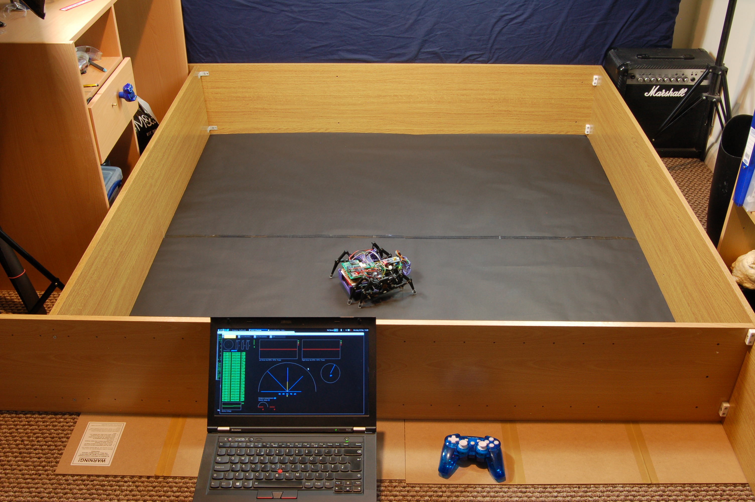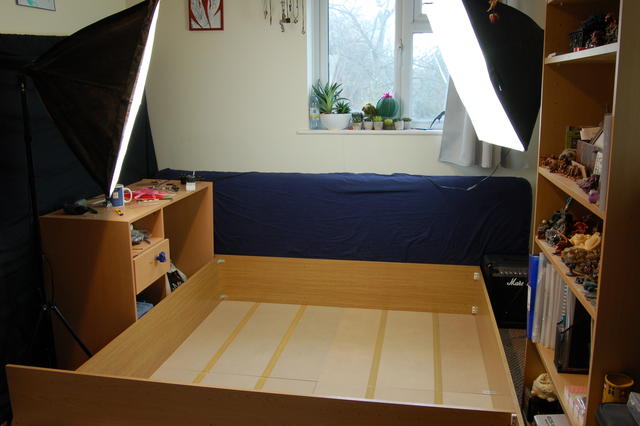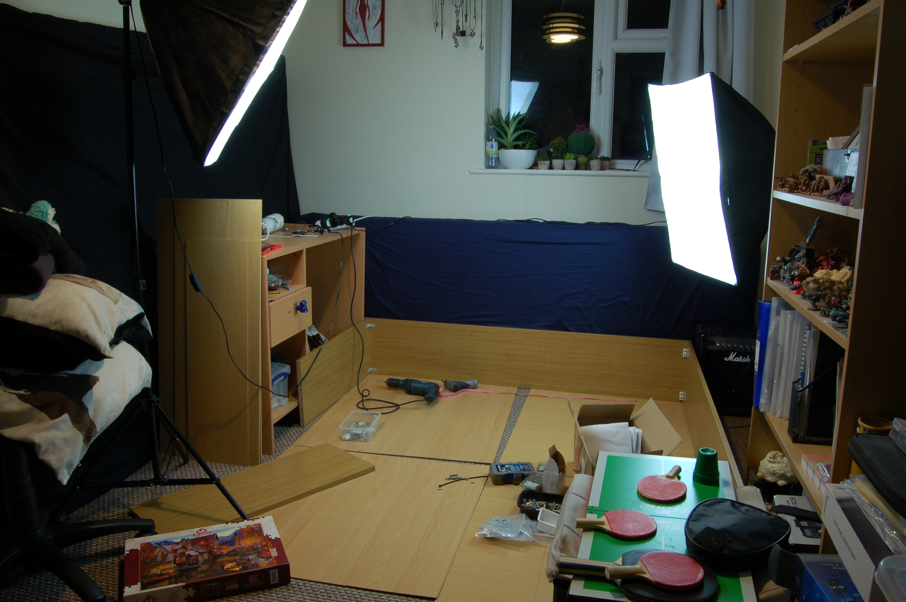 We found the ideal spot in one of the vast warehouses in our testing facility. (Actually, rearranged and took over most of a not-quite-spare room, ignoring the protests of several recent occupants.) The arena has been designed carefully and is made of exotic space-grade materials. (Actually, it’s made of parts of cheap bookcases that have been lying around for way too long, waiting to be assembled – all put together rather quickly and crudely.) And we have really cool studio lights (“borrowed” from an unsuspecting family member)!