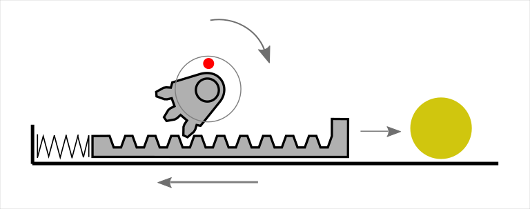But we also need a way to somehow disengage the pinion from the rack, releasing it to hit the projectile. By using a half or a quarter of a gear for the pinion, we can make it periodically engage and release the rack!