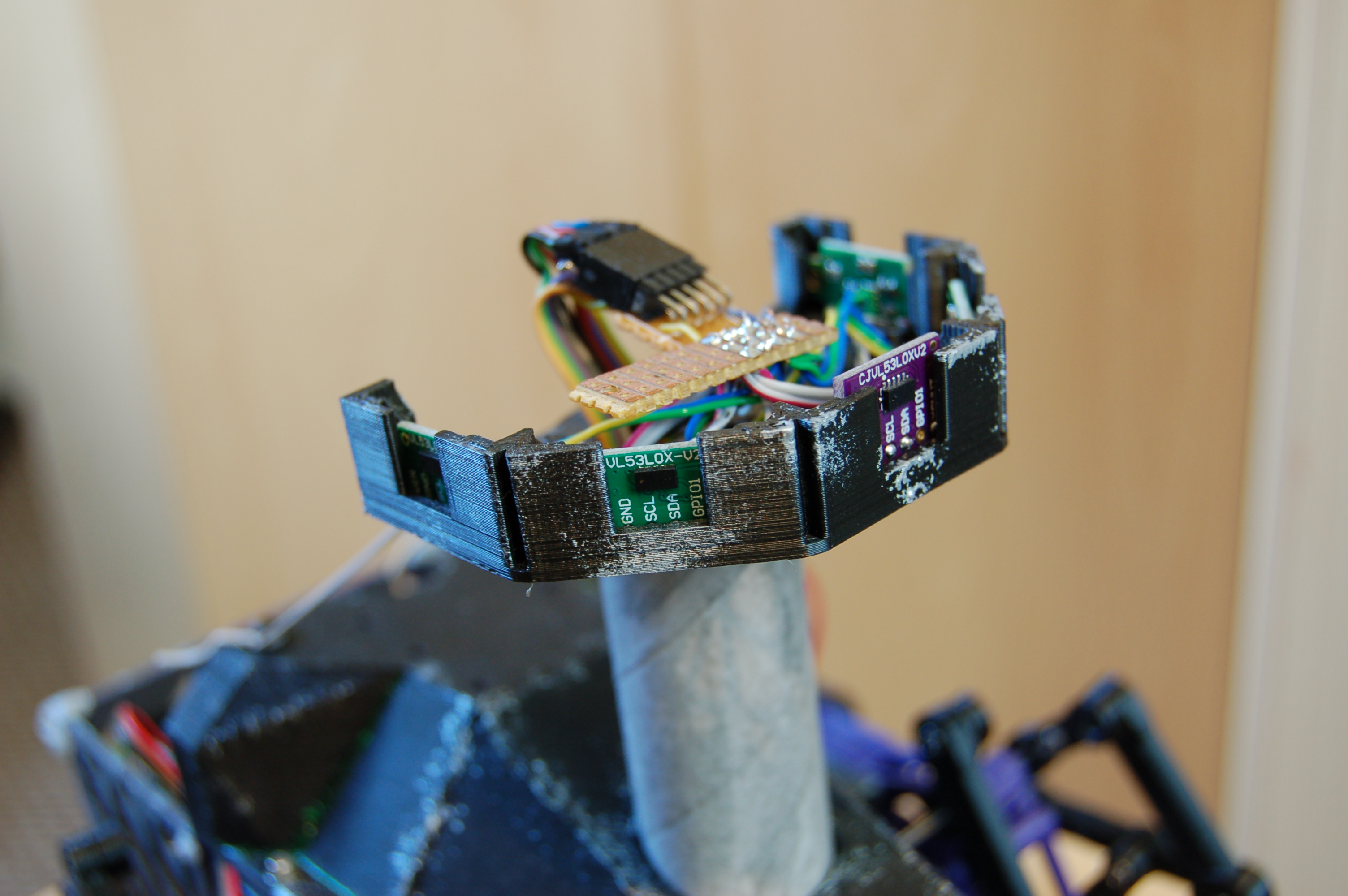 FAROS-2: new version of our distance sensor array: contains five VL53L0X sensors in a half-circle. Can be mounted either at the top of a mast (to give it clear view of arena walls in all directions) or lower, at the front (when the shooter attachment is mounted at the top instead – in this case the two side-facing sensors are blocked by legs).