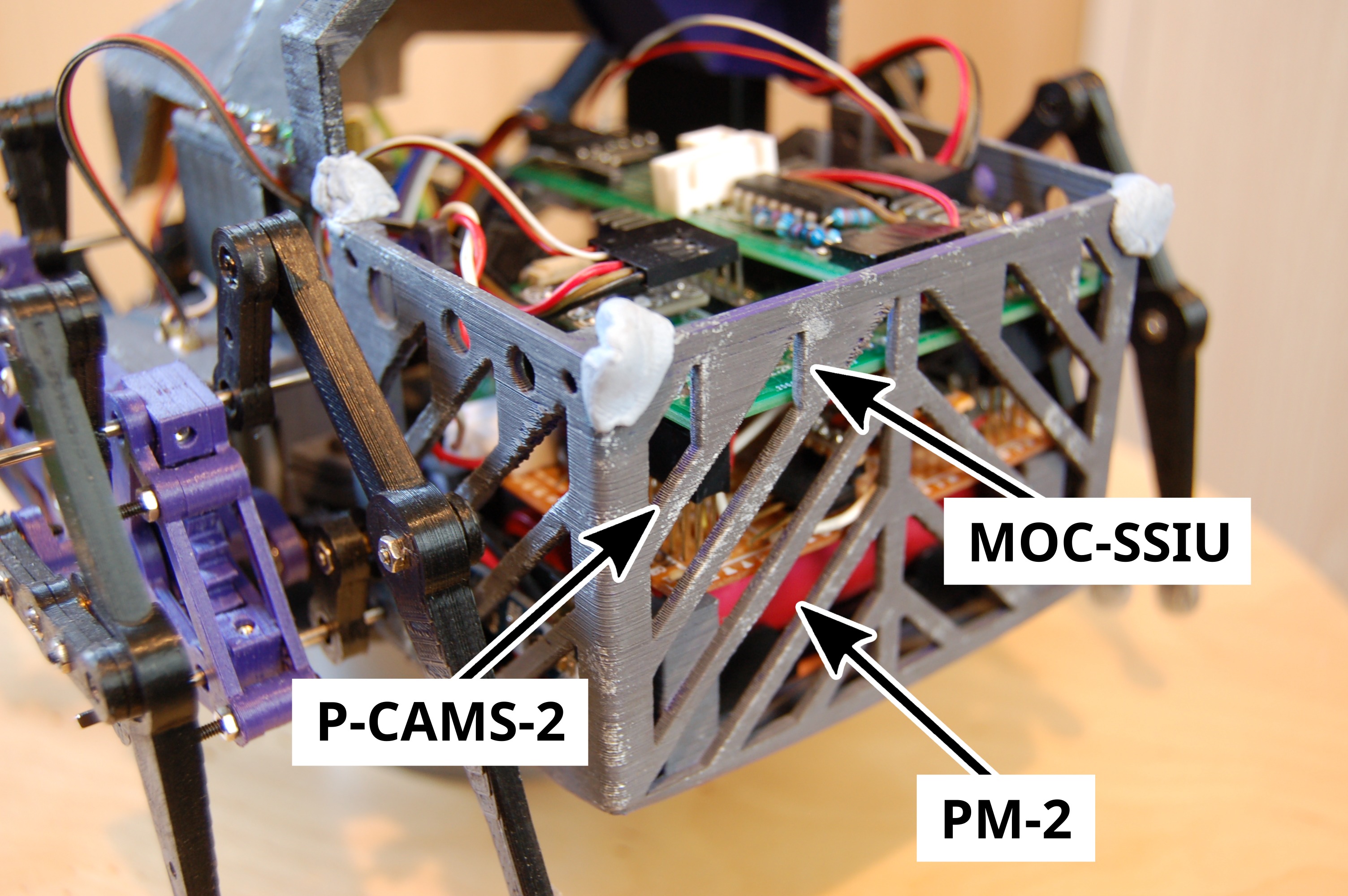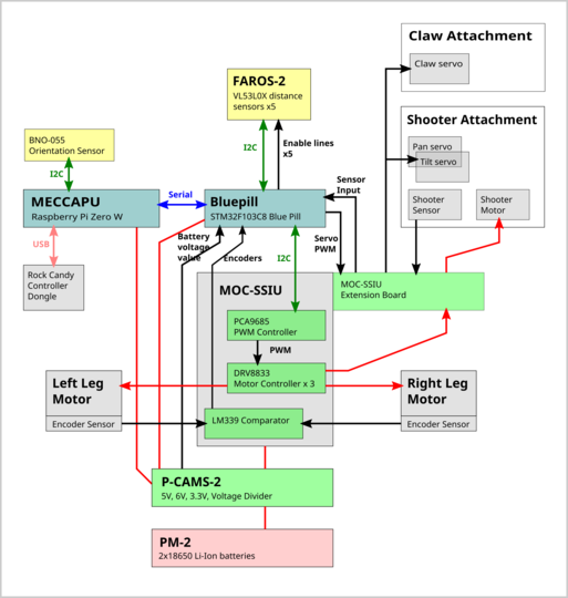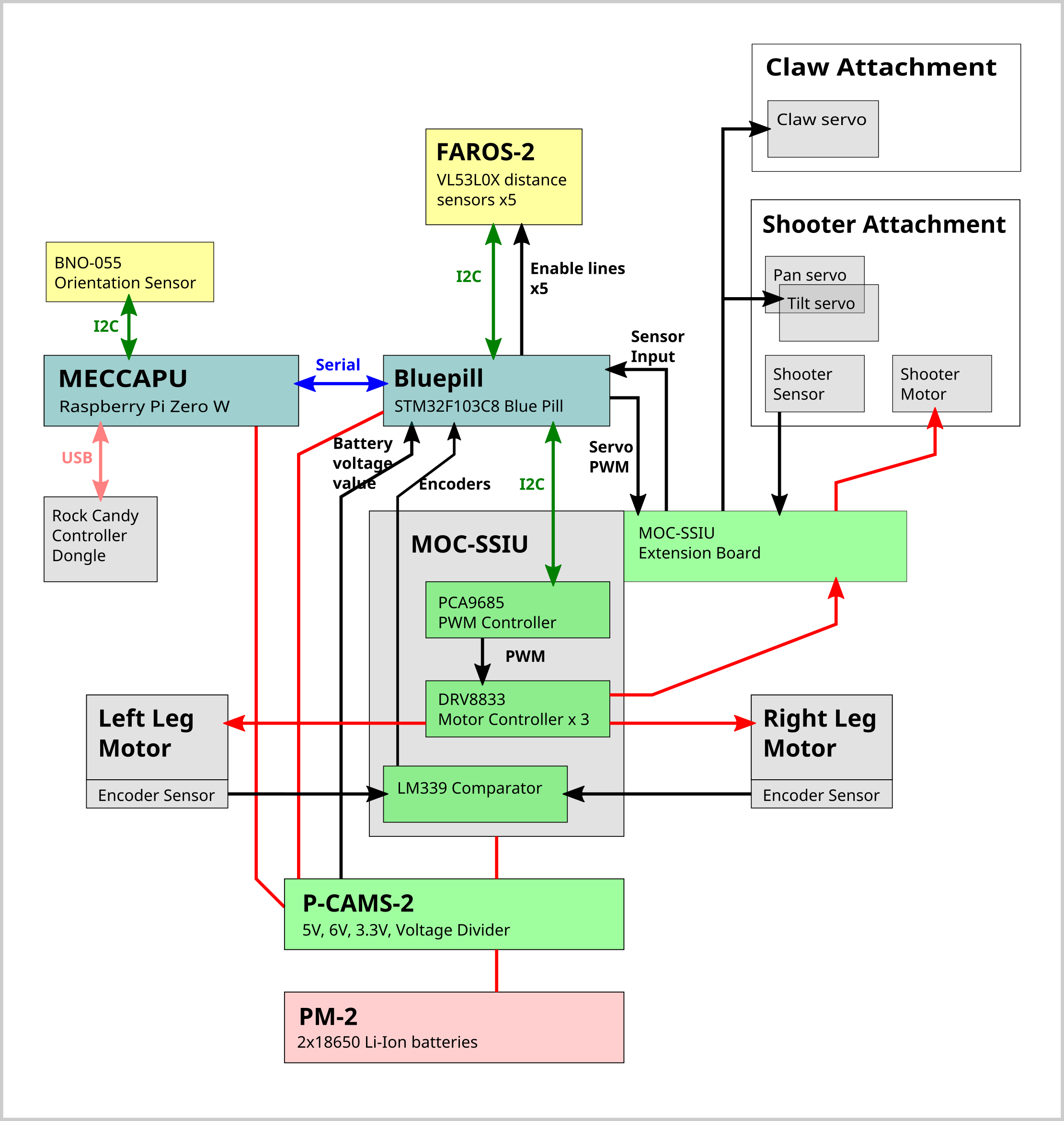 Leg Motors: the legs are driven by two DC gear motors and DRV8833 motor drivers (on MOC-SSIU). They have simple optical encoders to control speed.