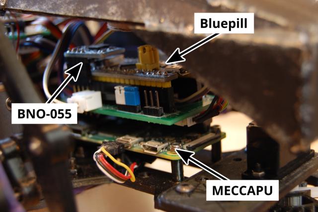 MECCAPU – Mars Exploration Central Computing And Processing Unit: a Raspberry Pi Zero W, inherited from our 2019 robot, responsible for all high level control. It’s connected to three other components: the BNO-055 sensor (via I2C), the dongle for the Rock Candy controller and, most importantly, to the Bluepill board via serial.
